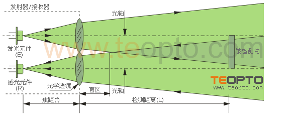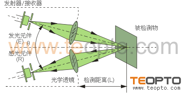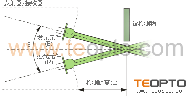 | (6)夹角式 这种方式是把发射器与接收器构为一体,发射器与接收器形成一个角度,发射光聚焦点与接收光聚焦交叉区域检测物体,用于精细检测,如标记检测等。如图6: |