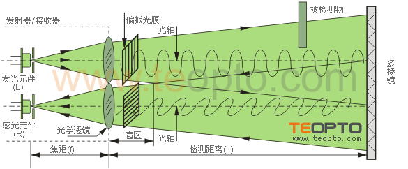 | ②具有M.S.R功能的反射器式光电开关,如果被检测物是平面而且有光泽,则会产生误动作,欲解决此问题,可采用M.S.R功能,它的主要工作原理是基于角矩阵反射器能使偏振光方向改变90°,采用互相垂直的偏振光膜片放在双镜头前,所以使用角矩阵反射器,光路闭合。如果是平面镜或反光率比较的物体(如:玻璃瓶等)不能改变偏振方向,由它阻挡而产生的反射光不能进入受光器,因此它可以很容易被检测到,从而解决了由它表面反射而它引起的误动作问题。如图3b: |