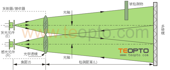 | (5)限定反射式 这种方式是把发射器与接收器构为一体,发射器与接收器形成一个角度,发射光轴与接收光轴交叉区域灵敏度最佳。如图5: |