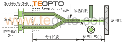 | ③:同轴反射,发射器与接收器构为一体,把光纤套入发射器与接收器(光纤放大器)。光纤头为两根光纤并为一根的形式,发射光纤在中间,接受光纤围着其圆周排列。可以直接反射与镜面反射,取决于光纤放大器的光学结构。如图8c: |