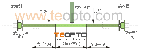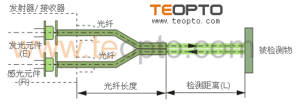 | ②:直接反射式,发射器与接收器构为一体,把光纤套入发射器与接收器(光纤放大器),光纤头为两根光纤并行,直接检测物体。如图8b: |