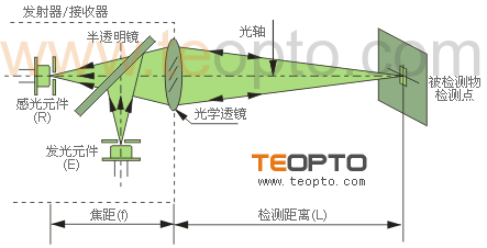 | (7)同轴检测式(单镜头) 这种方式是把发射器与接收器构为一体,发射光通过镀膜的半透明镜片45°折射后通过镜头聚焦发射出去,接收光线通过聚焦镜头入射到接收器,主要用于标志检测。目前主流的颜色传感器、标志传感器大多采用这样方式。如图7: |